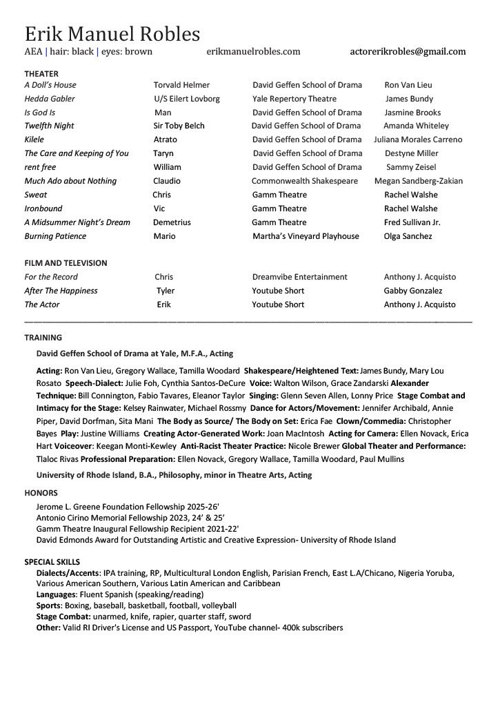 Erik Manuel Robles is a first-generation American of Dominican and Puerto Rican heritage, raised in Providence, Rhode Island. He holds a bachelor’s degree in Philosophy and received his MFA in Acting from the David Geffen School of Drama at Yale University in 2026. His work is drawn to complex characters, dangerous language, and the humor that lives inside the human condition.